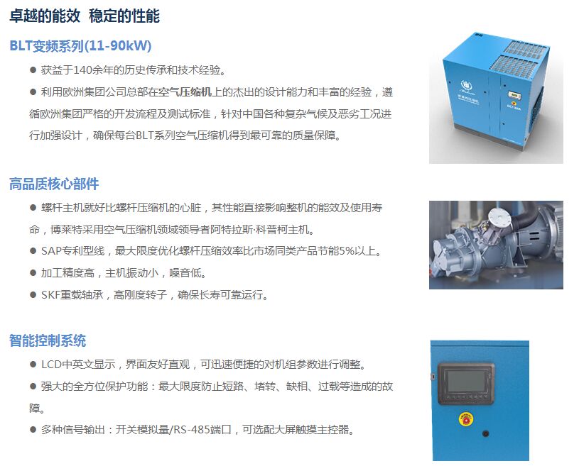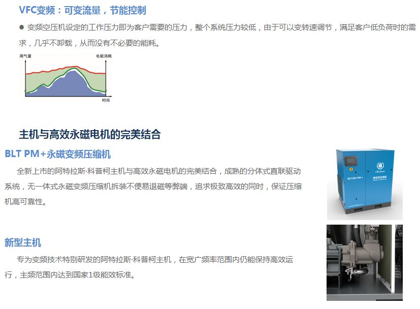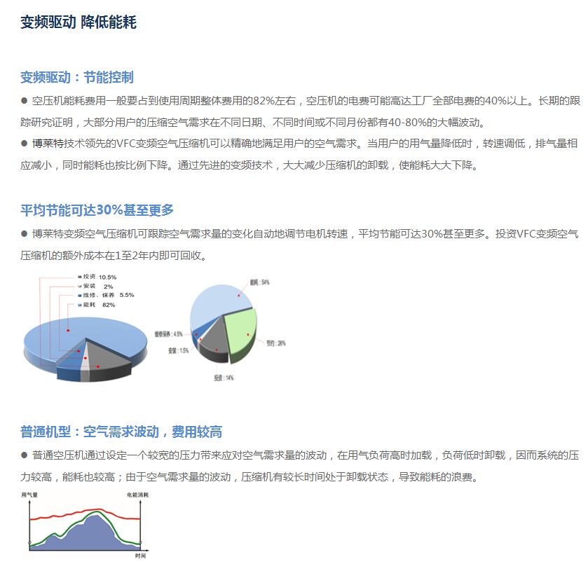 BLT PM+&VFC永磁變頻系列空氣壓縮機的VFC技術可跟蹤空氣的需求量變化自動地調(diào)節(jié)電機的轉(zhuǎn)速,平均節(jié)能效果可以達到30%甚至更多,降低整個壓縮機平均壽命周期成本的26%。博萊特變頻空氣壓縮機